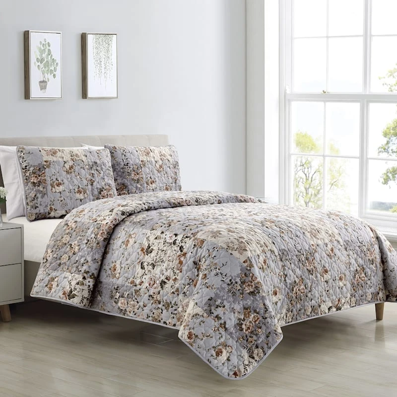 Enjoy an abundant floral field with grey, tan and brown and revamp your extra bedroom with our quilted 3-pc. full/queen quilt set. Complete with everything you’ll need to breathe new life into a bedroom. Diamond stitching details combine for a refreshing, dynamic look. Made of polyester microfiber, each piece has a comfy, cozy feel. Full/queen set includes: one quilt and two shams.