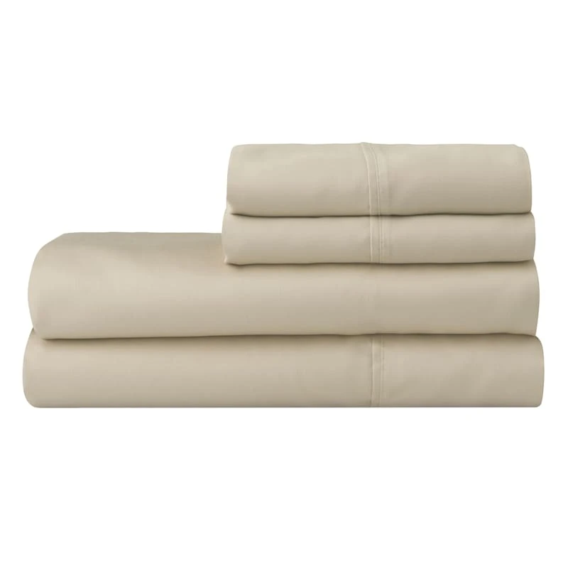 Apply this linen tan 500 thread count polyester and cotton queen sheet set and relax into a beautiful night’s sleep. With a nice selection of solid hues, you can refresh the look to your master bedroom or guest room with ease. We feel it’s a plus that these sheets have deep pockets, and fit comfortably over mattress toppers and thicker mattresses, up to 18”. Includes fitted sheet, flat sheet; twin size comes with one pillowcase, and all larger sizes come with two.