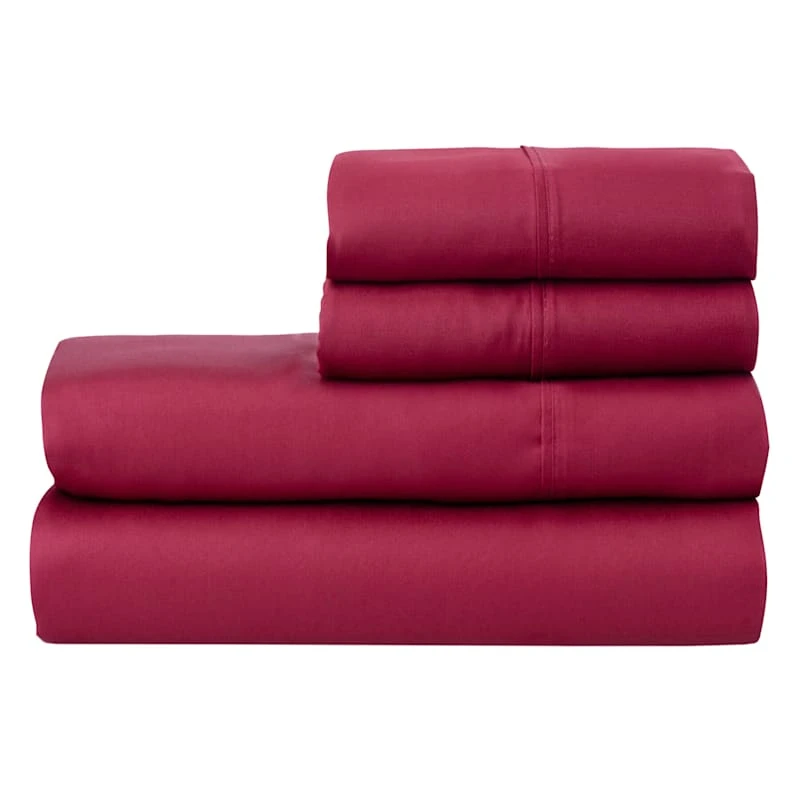 Enjoy a peaceful night’s sleep with our 4-piece queen king sheet set crafted of a 500 thread-count cotton/polyester blend. The exciting red hue gives a refreshing, relaxing and colorful feel to any bed. Queen set includes: one flat sheet, one fitted sheet and two pillowcases.