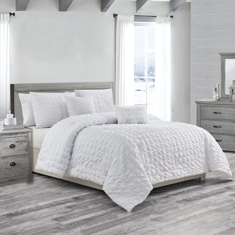Our Seersucker 5-piece queen comforter set provides a soft, soothing update to your bedroom. Its mini box seersucker treatment on white seems 3-D, giving the decorative modern design wonderful life. With all the attention to detail, our white Seersucker king bedding set will create a completely new look for any bedroom in your home.