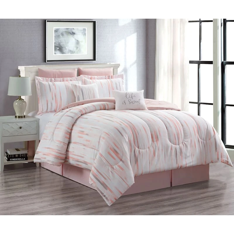 Refresh any bedroom with our Kitson queen 8-pc. Bed in a Bag Set. These coordinating pieces showcase a pink and white brushed stripe print with quilted details that offer a touch of texture. The soft microfiber fabric will keep you cozy.