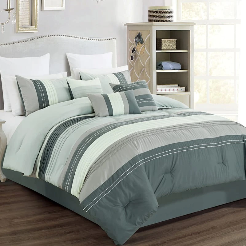 Cozy up and doze off with this grey and ivory bedding in a bag set. Luxury microfiber fabric with a striped pattern will give your bedroom a modern look with a touch of Art Deco flair. Plus, itโs easy to coordinate your bed โ this 7-piece queen comforter set comes with everything you need.