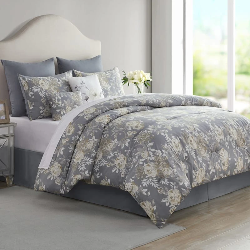Go neutral and floral with our Akiro 8-pc. bedding set. These coordinating pieces showcase a soothing grey, taupe and ivory floral branch motif with subtle quilted details that offer a touch of texture. The soft microfiber fabric will keep you cozy.