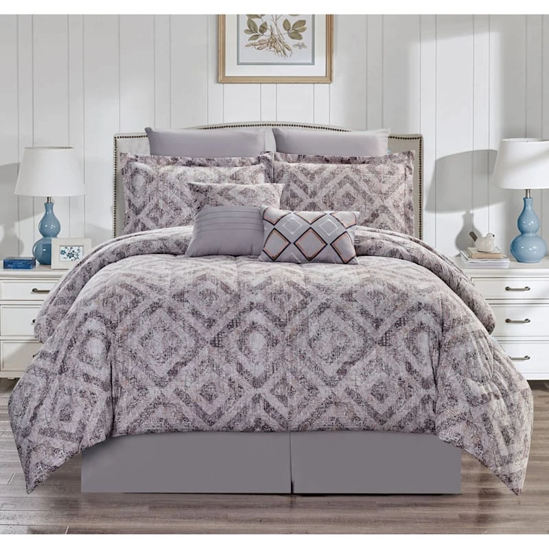 Our Asuri 8-piece queen comforter set provides a rich geometric update to your bedroom. Its repeating diamond lattice pattern on a grey backdrop seems 3-D, giving the decorative modern design wonderful life. With all the attention to detail, our grey and charcoal Asuri queen bedding set will create a completely new look for any bedroom in your home.