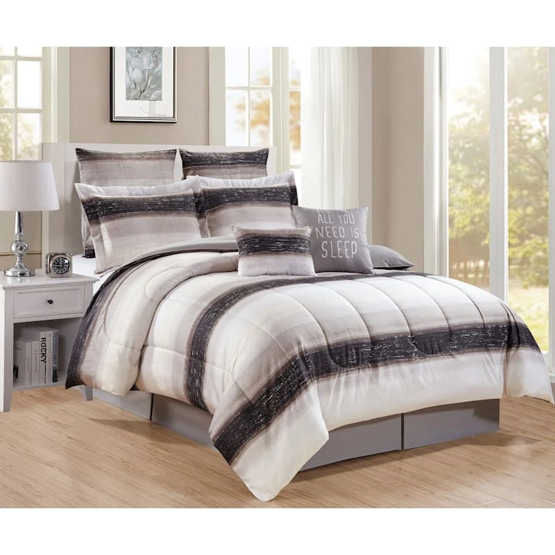Ombre stripes are all the rage! Refresh any bedroom with our Wood Stripe 8-pc. queen comforter set. These coordinating pieces showcase an interesting woodgrain like stripe pattern in tan, grey and black with quilted details that offer a touch of texture. The soft microfiber fabric will keep you cozy.