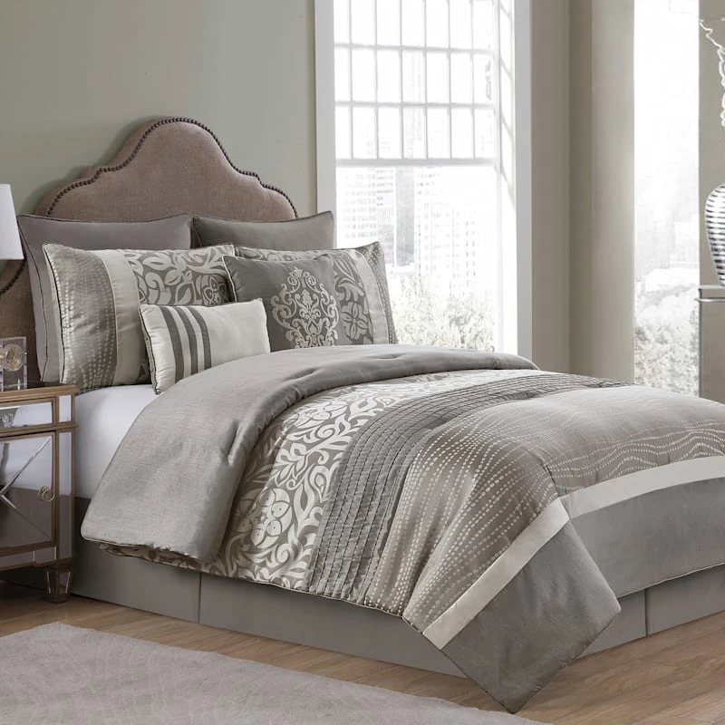 Instantly elevate your bedroom decor with the VCNY Home Arcadia taupe embroidered king comforter set that features a beautiful blend of stylized florals, abstract patterns, pleated accents and an allover lustrous sheen in taupe and ivory. Made of a supremely soft microfiber fabric, this 8-piece bedding set includes a comforter, shams, Euro shams, bedskirt and two decorative pillows to complete the look.