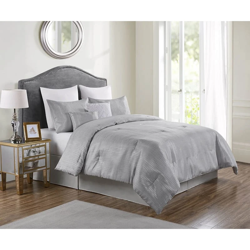 Our ultra-chic and affordable Bern bedding set brings a refined style and enhanced beauty to your bedroom. This 8-pc. ivory/grey patchy stripe queen comforter set creates tranquility, and the soft microfiber fabric helps you sleep comfortably.