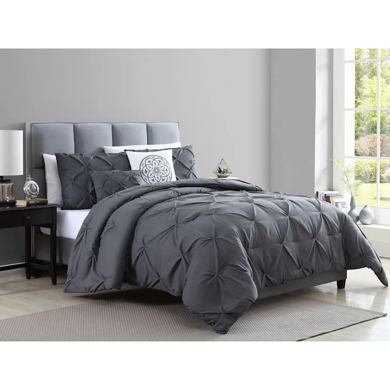 Treat your master suite to a touch of texture with our Blanca 5-pc. king comforter set. These coordinating pieces showcase a dramatic diamond grey motif with subtle quilted details that offer added texture. The soft microfiber fabric will keep you cozy.