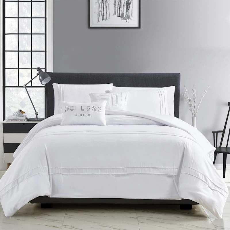 Our Logan 5-piece queen comforter set provides a soft, soothing update to your bedroom. Its pinched stripe treatment on white seems 3-D, giving the decorative modern design wonderful life. With all the attention to detail, our white Logan queen bedding set will create a completely new look for any bedroom in your home.