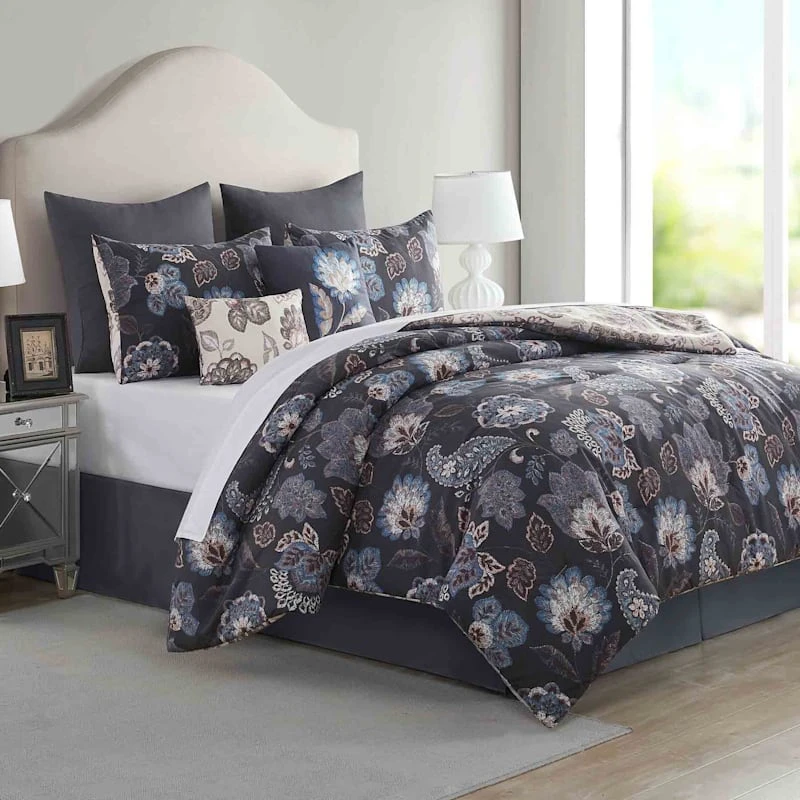 Add old-world charm with our Shadie 8-pc. bedding set. These coordinating pieces showcase a dramatic navy blue, light blue, brown and ivory Jacobean paisley motif with subtle quilted details that offer a touch of texture. The soft microfiber fabric will keep you cozy.