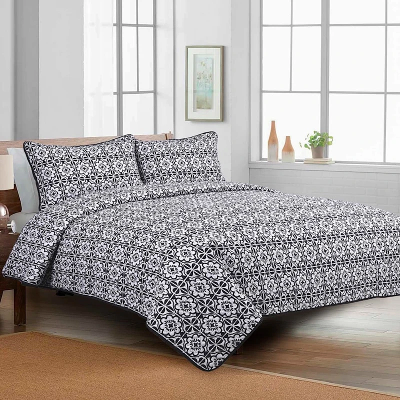 Award-winning London-based fashion designer, illustrator and innovator Tracey Boyd has created a new and exclusive collection for At Home. Our 3-Piece talavera black and white quilt king comforter set provides a rich solid-color update to your bedroom. It’s tonal black and white patten on a grey backdrop feels as if it almost has a three-dimensional effect giving this decorative, modern design wonderful life. With all the attention to detail, our black and white king bedding set will offer a completely new look for any bedroom in your home.